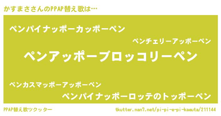 かすまささんのPPAP替え歌は… 『ペンアッポーブロッコリーペン』『ペンパイナッポーカッポーペン』『ペンパイナッポーロッテのトッポーペン』 ツクッター #PPAP替え歌ツクッター http://tkutter.nan7.net/pi-pi-e-pi-kaeuta/211144/