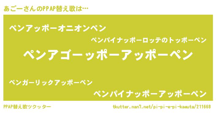 | ピコ太郎風あだ名 | 『アゴ八郎』『ピア六郎』『ピコア郎』 |
