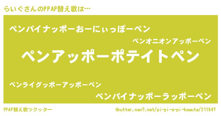 | 意味不明あだ名 | 『自称らいぐ』『しいたけ科らいぐ属』 |