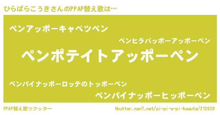 ひらばらこうきさんのPPAP替え歌は… 『ペンポテイトアッポーペン』『ペンアッポーキャベツペン』『ペンパイナッポーヒッポーペン』 ツクッター #PPAP替え歌ツクッター http://tkutter.nan7.net/pi-pi-e-pi-kaeuta/212620/