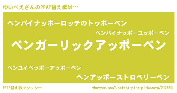 ゆいベえさんのPPAP替え歌は… 『ペンガーリックアッポーペン』『ペンパイナッポーロッテのトッポーペン』『ペンアッポーストロベリーペン』 ツクッター #PPAP替え歌ツクッター http://tkutter.nan7.net/pi-pi-e-pi-kaeuta/212893/