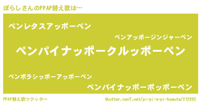 ぽらしさんのPPAP替え歌は… 『ペンパイナッポークルッポーペン』『ペンレタスアッポーペン』『ペンパイナッポーポッポーペン』 ツクッター #PPAP替え歌ツクッター http://tkutter.nan7.net/pi-pi-e-pi-kaeuta/212992/
