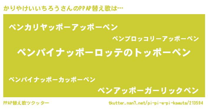 かりやけいいちろうさんのPPAP替え歌は… 『ペンパイナッポーロッテのトッポーペン』『ペンカリヤッポーアッポーペン』『ペンアッポーガーリックペン』 ツクッター #PPAP替え歌ツクッター http://tkutter.nan7.net/pi-pi-e-pi-kaeuta/213594/
