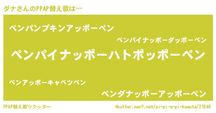 ダナさんのPPAP替え歌は… 『ペンパイナッポーハトポッポーペン』『ペンパンプキンアッポーペン』『ペンダナッポーアッポーペン』 ツクッター #PPAP替え歌ツクッター http://tkutter.nan7.net/pi-pi-e-pi-kaeuta/21546/