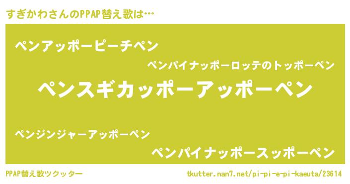 すぎかわさんのPPAP替え歌は… 『ペンスギカッポーアッポーペン』『ペンアッポーピーチペン』『ペンパイナッポースッポーペン』 ツクッター #PPAP替え歌ツクッター http://tkutter.nan7.net/pi-pi-e-pi-kaeuta/23614/