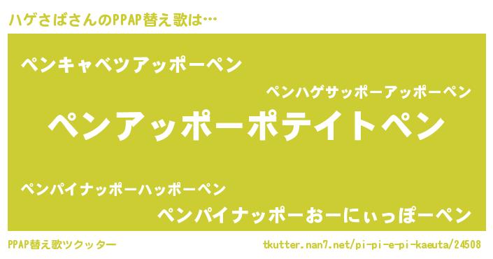 ハゲさばさんのPPAP替え歌は… 『ペンアッポーポテイトペン』『ペンキャベツアッポーペン』『ペンパイナッポーおーにぃっぽーペン』 ツクッター #PPAP替え歌ツクッター http://tkutter.nan7.net/pi-pi-e-pi-kaeuta/24508/