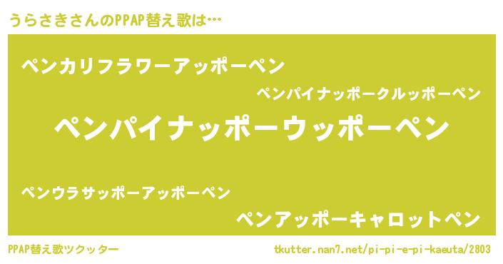 | ピコ太郎風あだ名 | 『ピコウ郎』『ウコ二郎』『ピウ史郎』 |