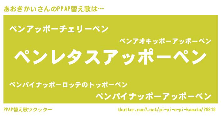 あおきかいさんのPPAP替え歌は… 『ペンレタスアッポーペン』『ペンアッポーチェリーペン』『ペンパイナッポーアッポーペン』 ツクッター #PPAP替え歌ツクッター http://tkutter.nan7.net/pi-pi-e-pi-kaeuta/29318/
