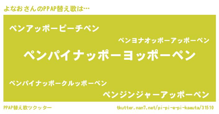 よなおさんのPPAP替え歌は… 『ペンパイナッポーヨッポーペン』『ペンアッポーピーチペン』『ペンジンジャーアッポーペン』 ツクッター #PPAP替え歌ツクッター http://tkutter.nan7.net/pi-pi-e-pi-kaeuta/31510/
