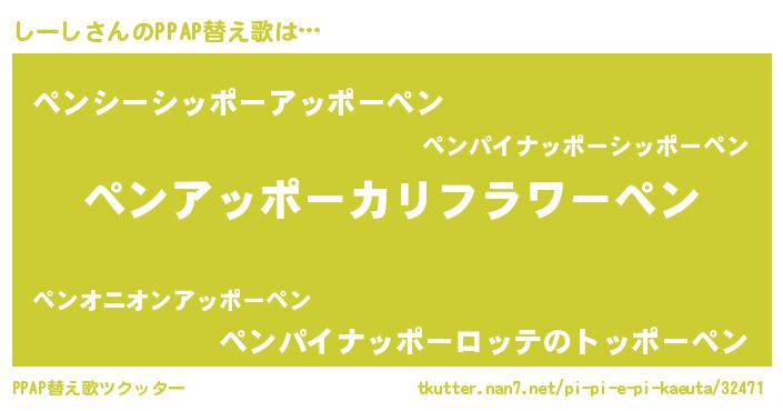 しーしさんのPPAP替え歌は… 『ペンアッポーカリフラワーペン』『ペンシーシッポーアッポーペン』『ペンパイナッポーロッテのトッポーペン』 ツクッター #PPAP替え歌ツクッター http://tkutter.nan7.net/pi-pi-e-pi-kaeuta/32471/