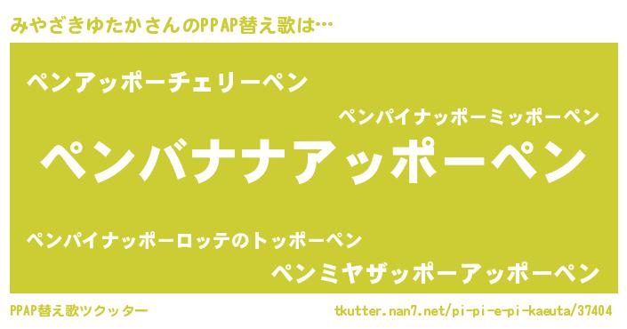 みやざきゆたかさんのPPAP替え歌は… 『ペンバナナアッポーペン』『ペンアッポーチェリーペン』『ペンミヤザッポーアッポーペン』 ツクッター #PPAP替え歌ツクッター http://tkutter.nan7.net/pi-pi-e-pi-kaeuta/37404/