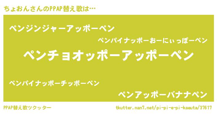 ちょおんさんのPPAP替え歌は… 『ペンチョオッポーアッポーペン』『ペンジンジャーアッポーペン』『ペンアッポーバナナペン』 ツクッター #PPAP替え歌ツクッター http://tkutter.nan7.net/pi-pi-e-pi-kaeuta/37617/