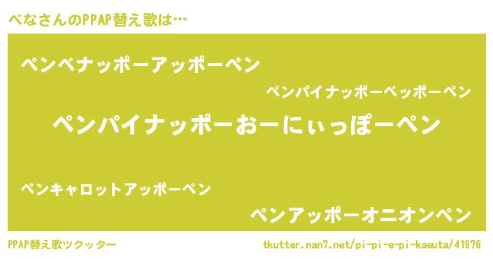 べなさんのPPAP替え歌は… 『ペンパイナッポーおーにぃっぽーペン』『ペンベナッポーアッポーペン』『ペンアッポーオニオンペン』 ツクッター #PPAP替え歌ツクッター http://tkutter.nan7.net/pi-pi-e-pi-kaeuta/41976/