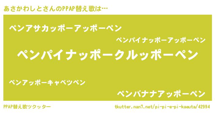 あさかわしとさんのPPAP替え歌は… 『ペンパイナッポークルッポーペン』『ペンアサカッポーアッポーペン』『ペンバナナアッポーペン』 ツクッター #PPAP替え歌ツクッター http://tkutter.nan7.net/pi-pi-e-pi-kaeuta/42994/