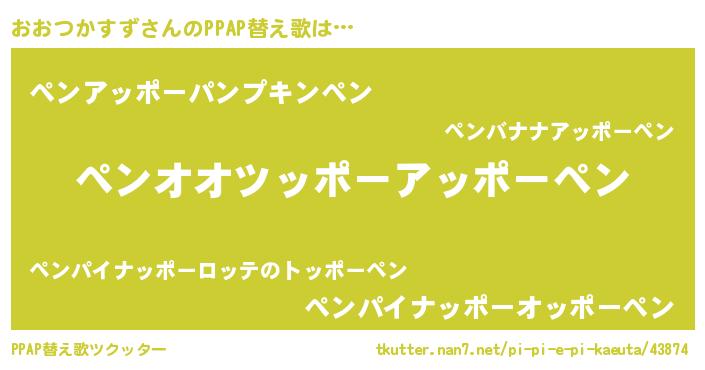おおつかすずさんのPPAP替え歌は… 『ペンオオツッポーアッポーペン』『ペンアッポーパンプキンペン』『ペンパイナッポーオッポーペン』 ツクッター #PPAP替え歌ツクッター http://tkutter.nan7.net/pi-pi-e-pi-kaeuta/43874/