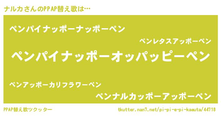 ナルカさんのPPAP替え歌は… 『ペンパイナッポーオッパッピーペン』『ペンパイナッポーナッポーペン』『ペンナルカッポーアッポーペン』 ツクッター #PPAP替え歌ツクッター http://tkutter.nan7.net/pi-pi-e-pi-kaeuta/44718/