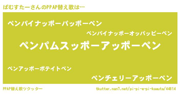 ぱむすたーさんのPPAP替え歌は… 『ペンパムスッポーアッポーペン』『ペンパイナッポーパッポーペン』『ペンチェリーアッポーペン』 ツクッター #PPAP替え歌ツクッター http://tkutter.nan7.net/pi-pi-e-pi-kaeuta/44814/