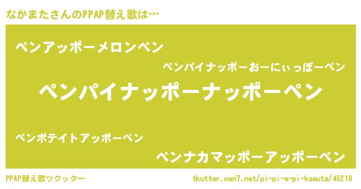 なかまたさんのPPAP替え歌は… 『ペンパイナッポーナッポーペン』『ペンアッポーメロンペン』『ペンナカマッポーアッポーペン』 ツクッター #PPAP替え歌ツクッター http://tkutter.nan7.net/pi-pi-e-pi-kaeuta/45210/