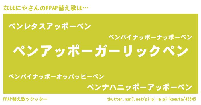 なはにやさんのPPAP替え歌は… 『ペンアッポーガーリックペン』『ペンレタスアッポーペン』『ペンナハニッポーアッポーペン』 ツクッター #PPAP替え歌ツクッター http://tkutter.nan7.net/pi-pi-e-pi-kaeuta/45845/