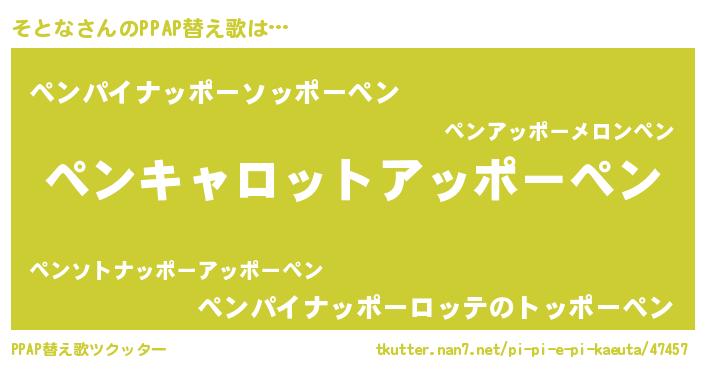 そとなさんのPPAP替え歌は… 『ペンキャロットアッポーペン』『ペンパイナッポーソッポーペン』『ペンパイナッポーロッテのトッポーペン』 ツクッター #PPAP替え歌ツクッター http://tkutter.nan7.net/pi-pi-e-pi-kaeuta/47457/
