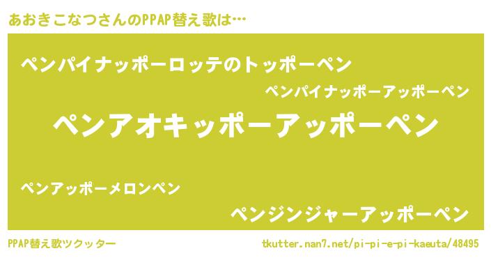 あおきこなつさんのPPAP替え歌は… 『ペンアオキッポーアッポーペン』『ペンパイナッポーロッテのトッポーペン』『ペンジンジャーアッポーペン』 ツクッター #PPAP替え歌ツクッター http://tkutter.nan7.net/pi-pi-e-pi-kaeuta/48495/