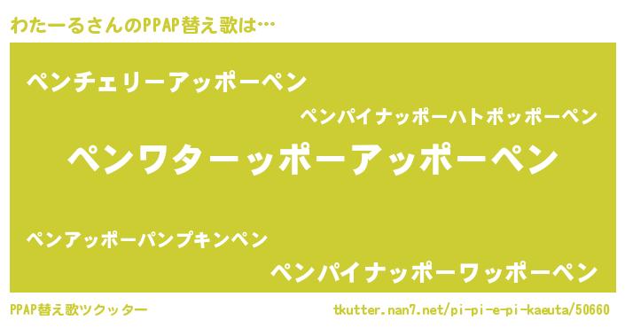 わたーるさんのPPAP替え歌は… 『ペンワターッポーアッポーペン』『ペンチェリーアッポーペン』『ペンパイナッポーワッポーペン』 ツクッター #PPAP替え歌ツクッター http://tkutter.nan7.net/pi-pi-e-pi-kaeuta/50660/