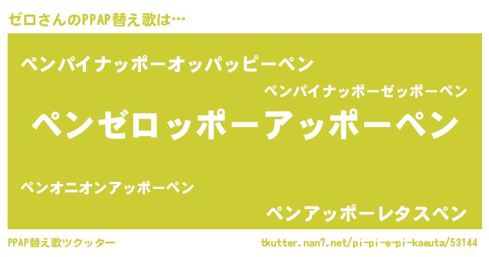 ゼロさんのPPAP替え歌は… 『ペンゼロッポーアッポーペン』『ペンパイナッポーオッパッピーペン』『ペンアッポーレタスペン』 ツクッター #PPAP替え歌ツクッター http://tkutter.nan7.net/pi-pi-e-pi-kaeuta/53144/