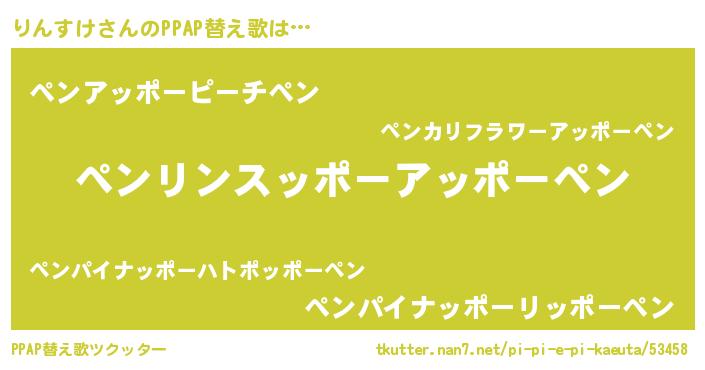りんすけさんのPPAP替え歌は… 『ペンリンスッポーアッポーペン』『ペンアッポーピーチペン』『ペンパイナッポーリッポーペン』 ツクッター #PPAP替え歌ツクッター http://tkutter.nan7.net/pi-pi-e-pi-kaeuta/53458/