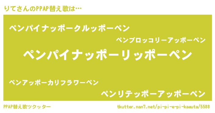 りてさんのPPAP替え歌は… 『ペンパイナッポーリッポーペン』『ペンパイナッポークルッポーペン』『ペンリテッポーアッポーペン』 ツクッター #PPAP替え歌ツクッター http://tkutter.nan7.net/pi-pi-e-pi-kaeuta/5588/