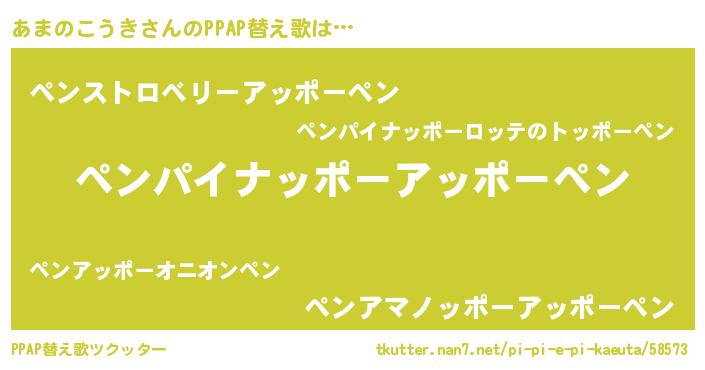 あまのこうきさんのPPAP替え歌は… 『ペンパイナッポーアッポーペン』『ペンストロベリーアッポーペン』『ペンアマノッポーアッポーペン』 ツクッター #PPAP替え歌ツクッター http://tkutter.nan7.net/pi-pi-e-pi-kaeuta/58573/