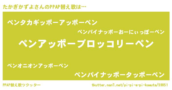 たかぎかずよさんのPPAP替え歌は… 『ペンアッポーブロッコリーペン』『ペンタカギッポーアッポーペン』『ペンパイナッポータッポーペン』 ツクッター #PPAP替え歌ツクッター http://tkutter.nan7.net/pi-pi-e-pi-kaeuta/59851/