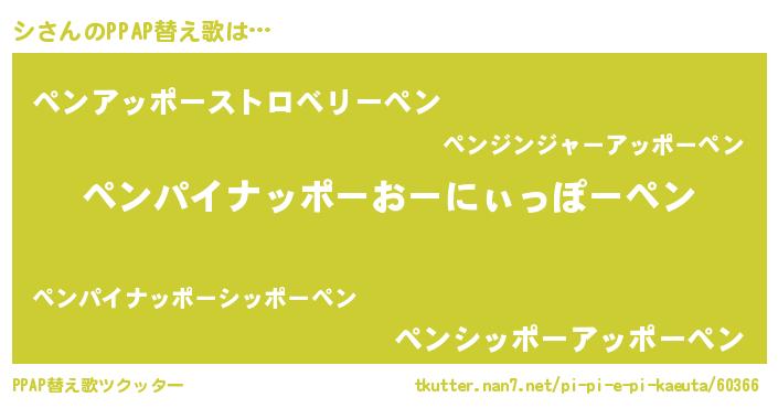 シさんのPPAP替え歌は… 『ペンパイナッポーおーにぃっぽーペン』『ペンアッポーストロベリーペン』『ペンシッポーアッポーペン』 ツクッター #PPAP替え歌ツクッター http://tkutter.nan7.net/pi-pi-e-pi-kaeuta/60366/