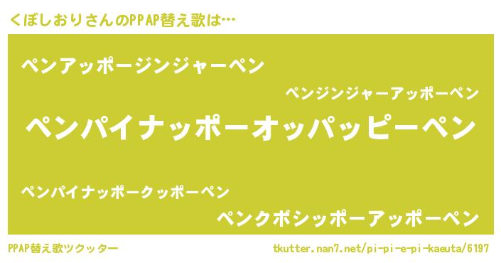 くぼしおりさんのPPAP替え歌は… 『ペンパイナッポーオッパッピーペン』『ペンアッポージンジャーペン』『ペンクボシッポーアッポーペン』 ツクッター #PPAP替え歌ツクッター http://tkutter.nan7.net/pi-pi-e-pi-kaeuta/6197/