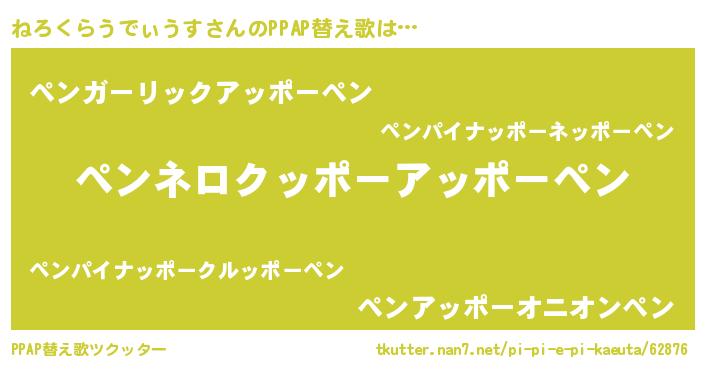 ねろくらうでぃうすさんのPPAP替え歌は… 『ペンネロクッポーアッポーペン』『ペンガーリックアッポーペン』『ペンアッポーオニオンペン』 ツクッター #PPAP替え歌ツクッター http://tkutter.nan7.net/pi-pi-e-pi-kaeuta/62876/