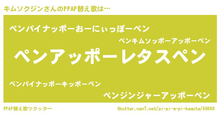 キムソクジンさんのPPAP替え歌は… 『ペンアッポーレタスペン』『ペンパイナッポーおーにぃっぽーペン』『ペンジンジャーアッポーペン』 ツクッター #PPAP替え歌ツクッター http://tkutter.nan7.net/pi-pi-e-pi-kaeuta/66080/