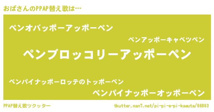 おばさんのPPAP替え歌は… 『ペンブロッコリーアッポーペン』『ペンオバッポーアッポーペン』『ペンパイナッポーオッポーペン』 ツクッター #PPAP替え歌ツクッター http://tkutter.nan7.net/pi-pi-e-pi-kaeuta/66863/