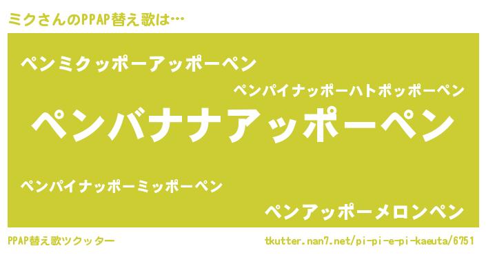 ミクさんのPPAP替え歌は… 『ペンバナナアッポーペン』『ペンミクッポーアッポーペン』『ペンアッポーメロンペン』 ツクッター #PPAP替え歌ツクッター http://tkutter.nan7.net/pi-pi-e-pi-kaeuta/6751/