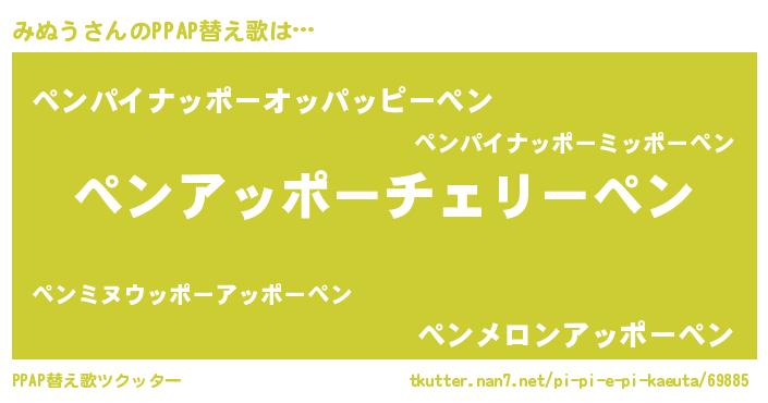 みぬうさんのPPAP替え歌は… 『ペンアッポーチェリーペン』『ペンパイナッポーオッパッピーペン』『ペンメロンアッポーペン』 ツクッター #PPAP替え歌ツクッター http://tkutter.nan7.net/pi-pi-e-pi-kaeuta/69885/