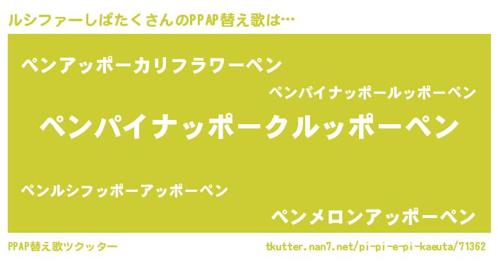 ルシファーしばたくさんのPPAP替え歌は… 『ペンパイナッポークルッポーペン』『ペンアッポーカリフラワーペン』『ペンメロンアッポーペン』 ツクッター #PPAP替え歌ツクッター http://tkutter.nan7.net/pi-pi-e-pi-kaeuta/71362/