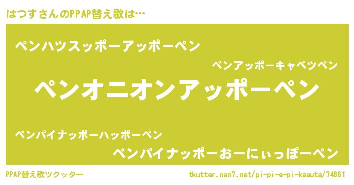 はつすさんのPPAP替え歌は… 『ペンオニオンアッポーペン』『ペンハツスッポーアッポーペン』『ペンパイナッポーおーにぃっぽーペン』 ツクッター #PPAP替え歌ツクッター http://tkutter.nan7.net/pi-pi-e-pi-kaeuta/74861/