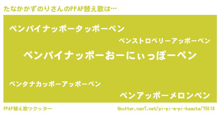 たなかかずのりさんのPPAP替え歌は… 『ペンパイナッポーおーにぃっぽーペン』『ペンパイナッポータッポーペン』『ペンアッポーメロンペン』 ツクッター #PPAP替え歌ツクッター http://tkutter.nan7.net/pi-pi-e-pi-kaeuta/75518/