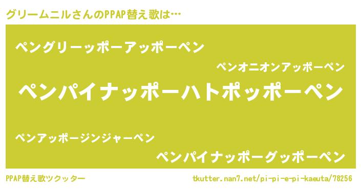 グリームニルさんのPPAP替え歌は… 『ペンパイナッポーハトポッポーペン』『ペングリーッポーアッポーペン』『ペンパイナッポーグッポーペン』 ツクッター #PPAP替え歌ツクッター http://tkutter.nan7.net/pi-pi-e-pi-kaeuta/78256/