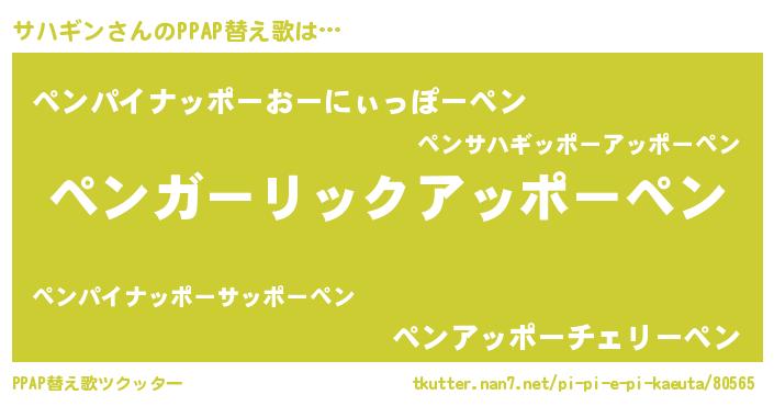 サハギンさんのPPAP替え歌は… 『ペンガーリックアッポーペン』『ペンパイナッポーおーにぃっぽーペン』『ペンアッポーチェリーペン』 ツクッター #PPAP替え歌ツクッター http://tkutter.nan7.net/pi-pi-e-pi-kaeuta/80565/