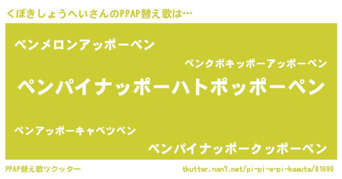 くぼきしょうへいさんのPPAP替え歌は… 『ペンパイナッポーハトポッポーペン』『ペンメロンアッポーペン』『ペンパイナッポークッポーペン』 ツクッター #PPAP替え歌ツクッター http://tkutter.nan7.net/pi-pi-e-pi-kaeuta/81690/