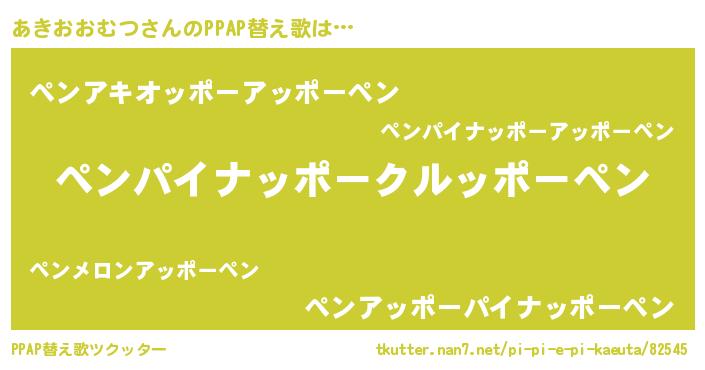 あきおおむつさんのPPAP替え歌は… 『ペンパイナッポークルッポーペン』『ペンアキオッポーアッポーペン』『ペンアッポーパイナッポーペン』 ツクッター #PPAP替え歌ツクッター http://tkutter.nan7.net/pi-pi-e-pi-kaeuta/82545/