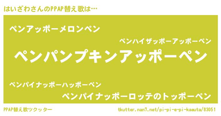 はいざわさんのPPAP替え歌は… 『ペンパンプキンアッポーペン』『ペンアッポーメロンペン』『ペンパイナッポーロッテのトッポーペン』 ツクッター #PPAP替え歌ツクッター http://tkutter.nan7.net/pi-pi-e-pi-kaeuta/83051/