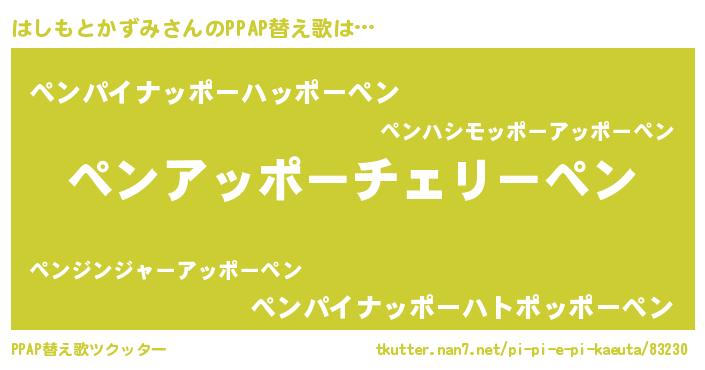 はしもとかずみさんのPPAP替え歌は… 『ペンアッポーチェリーペン』『ペンパイナッポーハッポーペン』『ペンパイナッポーハトポッポーペン』 ツクッター #PPAP替え歌ツクッター http://tkutter.nan7.net/pi-pi-e-pi-kaeuta/83230/