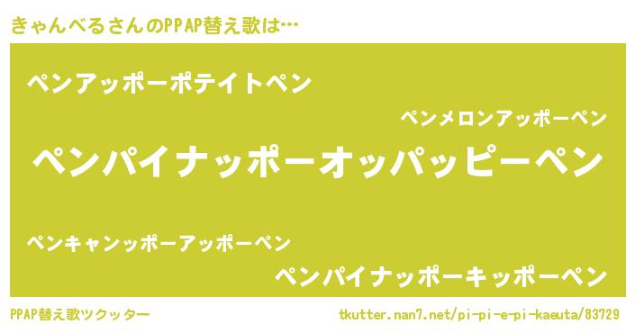 きゃんべるさんのPPAP替え歌は… 『ペンパイナッポーオッパッピーペン』『ペンアッポーポテイトペン』『ペンパイナッポーキッポーペン』 ツクッター #PPAP替え歌ツクッター http://tkutter.nan7.net/pi-pi-e-pi-kaeuta/83729/