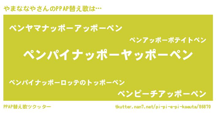 やまななやさんのPPAP替え歌は… 『ペンパイナッポーヤッポーペン』『ペンヤマナッポーアッポーペン』『ペンピーチアッポーペン』 ツクッター #PPAP替え歌ツクッター http://tkutter.nan7.net/pi-pi-e-pi-kaeuta/86870/