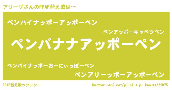 アリーザさんのPPAP替え歌は… 『ペンバナナアッポーペン』『ペンパイナッポーアッポーペン』『ペンアリーッポーアッポーペン』 ツクッター #PPAP替え歌ツクッター http://tkutter.nan7.net/pi-pi-e-pi-kaeuta/89075/